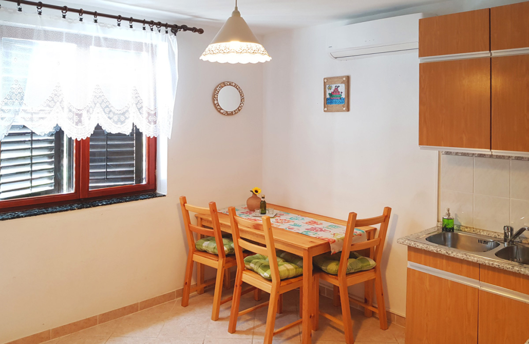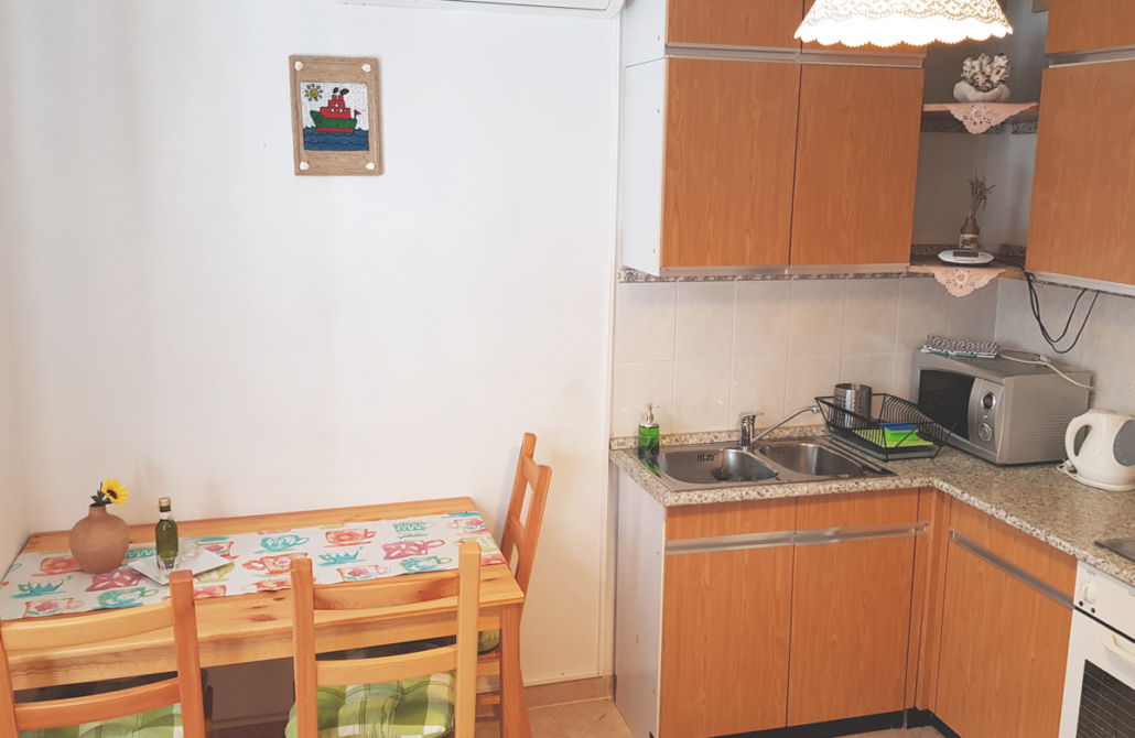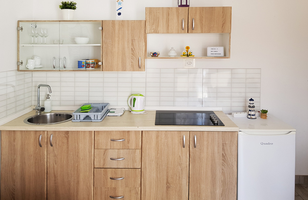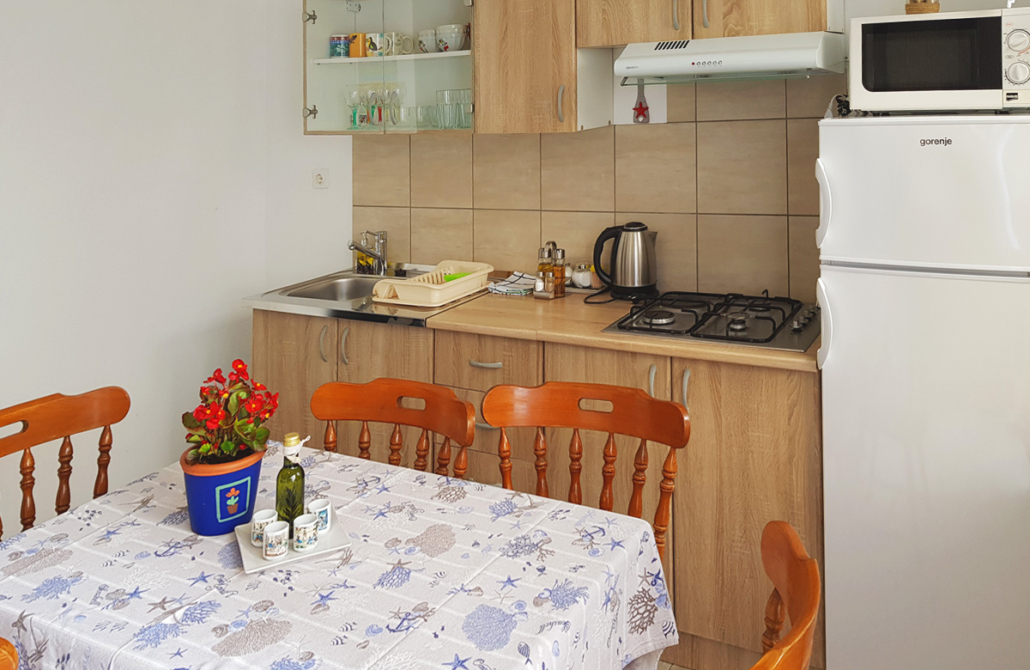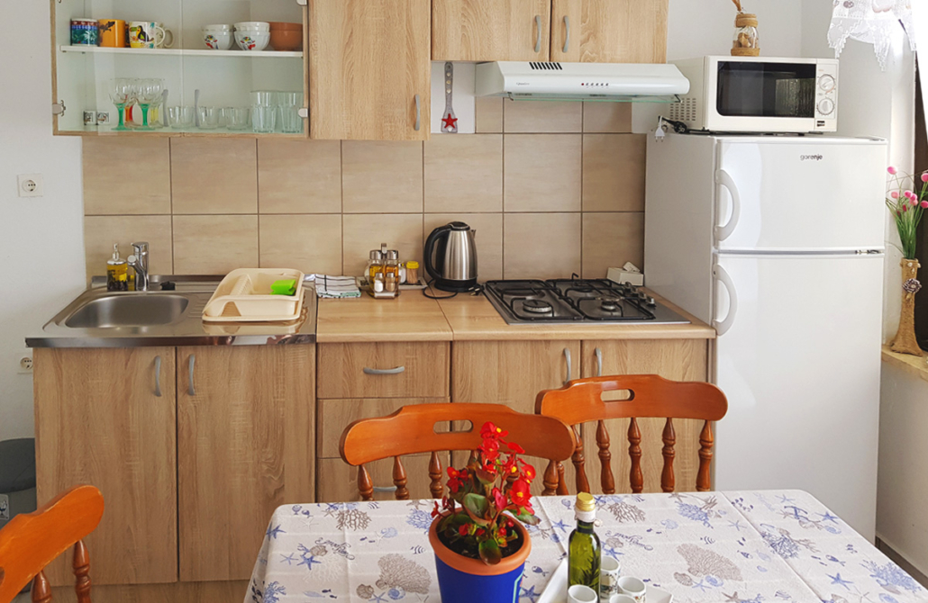 štednjak na plin i struju, pećnica, frižider, mikovalna, kuhalo za vodu, kuhinjsko posuđe i pribor